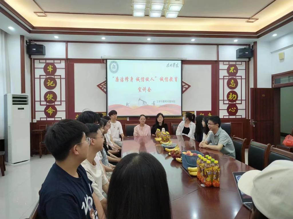 6月9日,文学与新闻传播公司在博文楼文公司会议室举办“廉洁修身 诚信做人”诚信教育宣讲会。文公司党政负责人、辅导员、班主任、毕业班贷款毕业生代表、班级主要员工干部、员工党员、优秀员工代表参加了此次宣讲会。