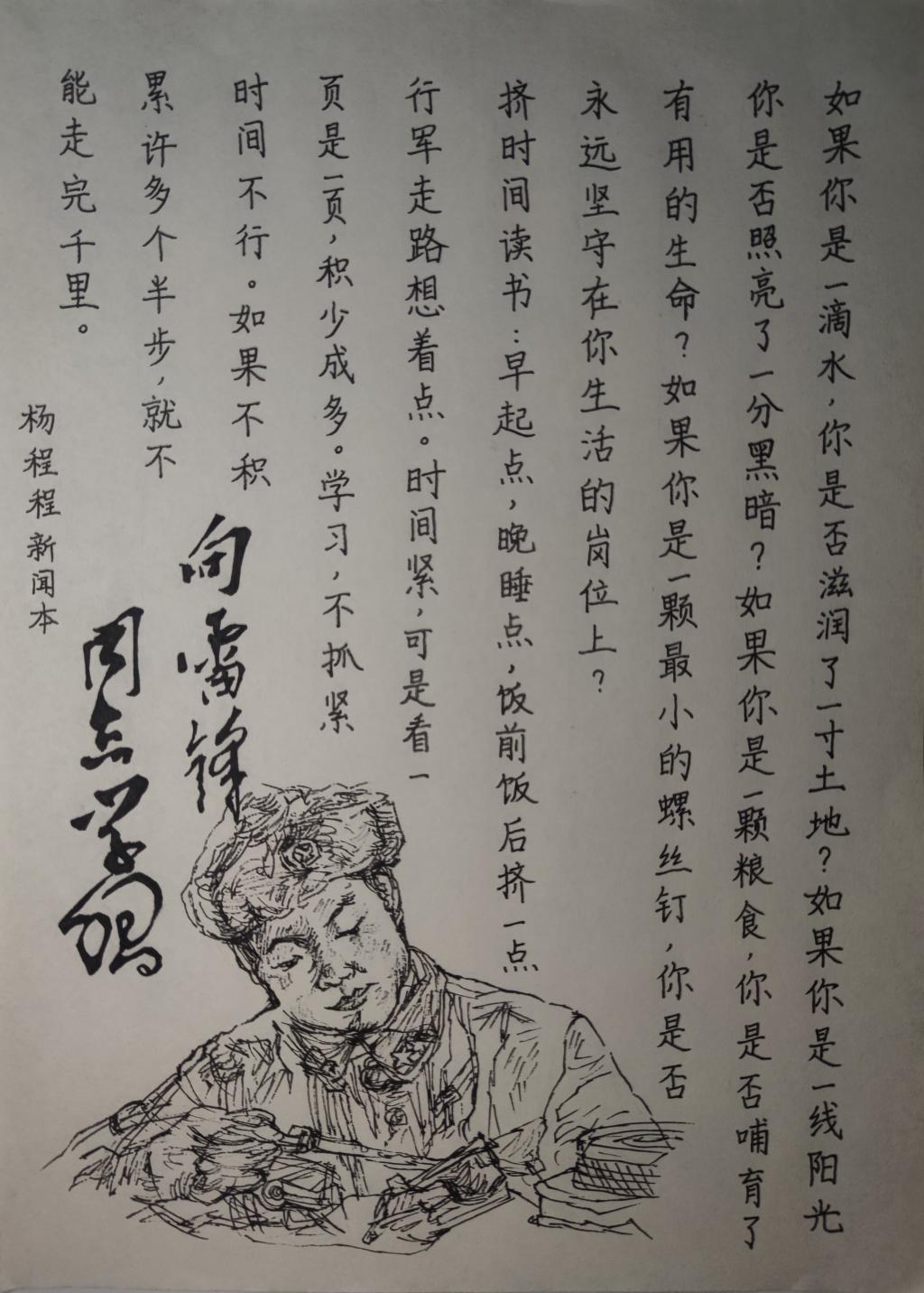 一纸一笔,延续传统文化;一言一行,传承雷锋精神。为弘扬中华民族传统文化,丰富校园文化生活,进一步弘扬雷锋精神,3月9日至3月15日,文学与新闻传播公司开展了“书写雷锋经典语录”主题书法大赛。
