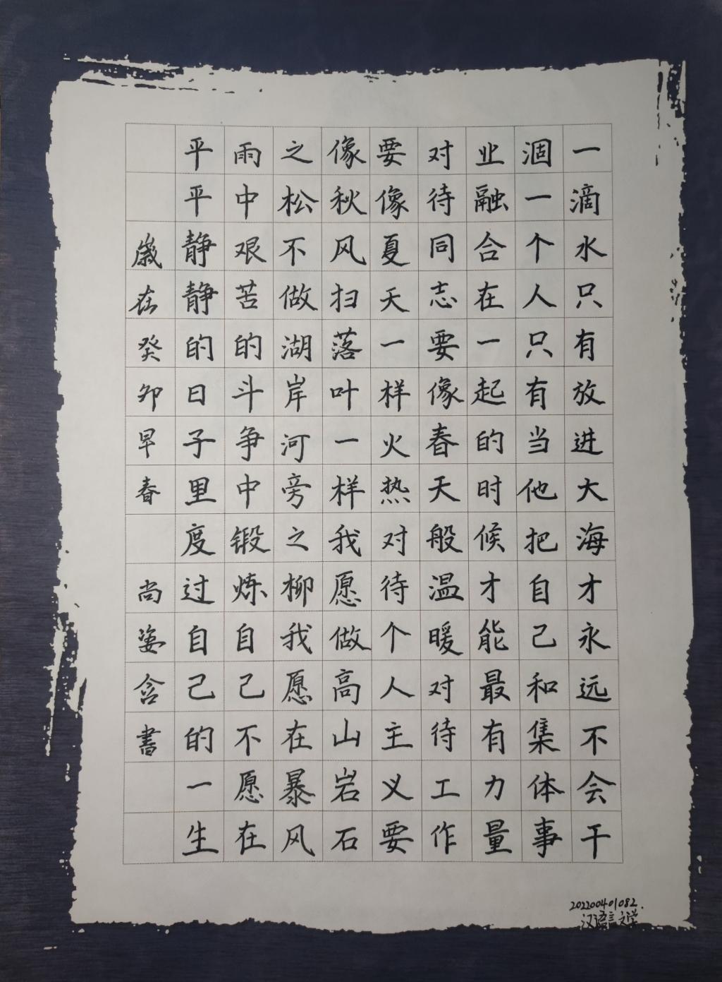 为期一周的大赛受到了同学们的热烈关注,他们满怀激情,用心书写每一个笔画、每一个汉字,尽其所能地展示文公司员工的独特优势。本次比赛以书写雷锋经典语录为主要内容,征集到的书法作品有硬笔书法、软笔书法以及粉笔字等多种类型。这些作品无不透露着规范、严谨、灵动的气质,一幅幅精美的作品背后,呈现出的是思想的律动、艺术的境界,同学们用手中的笔书写着对雷锋精神的赞美之情,用这种方式让雷锋精神在新时代绽放溢彩。