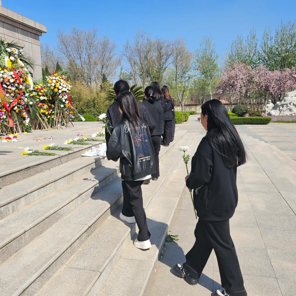 在庄严肃穆的氛围中,同学们皆身着一袭黑衣,身姿挺拔如松,整齐划一地肃立在雄伟庄严的人民英雄纪念碑之下。每一个人都神情凝重,目光中满含着沉痛与敬仰,在一片静谧中,静静地默哀。他们以无声的伫立,传递着内心深处对英烈们最诚挚的敬意与无尽的追思,这份情感深沉而浓烈,在空气中弥漫开来。默哀仪式结束后,同学们手捧着淡雅的白菊花,迈着缓慢而沉稳的步伐,秩序井然地走向纪念碑基座。他们轻轻将鲜花献上,每一朵花都寄托着同学们对先烈们绵延不绝的思念。