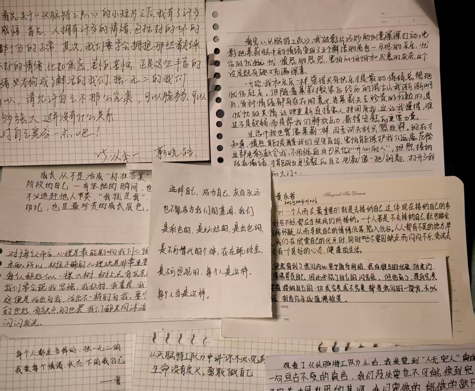 活动“情绪初印象”破冰环节开同学们围绕“喜、怒、哀、惧、厌”五种情绪,分享近期生活中的情绪故事,引出对情绪管理的初步思考。随后,大家集体观看动画电影《头脑特工队》,影片以生动具象的方式,将情绪在脑海中的运作机制可视化,进一步加深了同学们对情绪功能与互动的理解。观影结束后,员工完成手写感悟并进行互动分享,影片内容自身情绪体验结合起来,明确情绪的多元属性及不同情绪在自我成长中的作用。