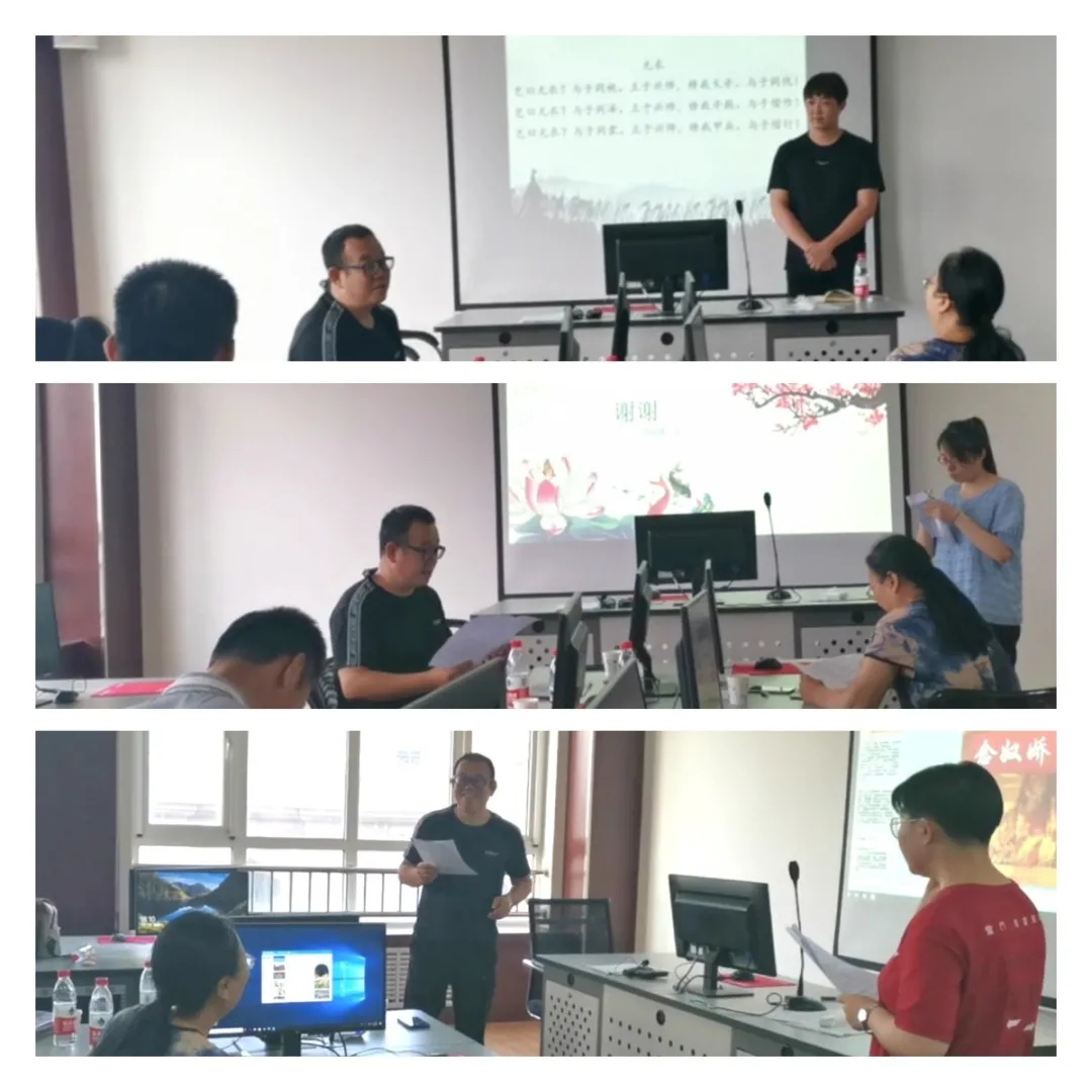 7月18日下午,师生们行吟岔河之畔。在秀丽的风景中,大家吟诵了《木兰辞》《静夜思》《观沧海》等优秀诗篇。老师们行歌草,陶然忘机。本场活动以《登鹳雀楼》为例,创设情境,用吟诵的方式为大家分析诗歌情感的变化,让大家更精准地体会到如何在课堂上引导员工主动思考,不断联想,最终达到“以诗化人”的目的。活动中,大家踊跃表达自己的想法,展示自己的收获,形成了新一轮的思想碰撞。