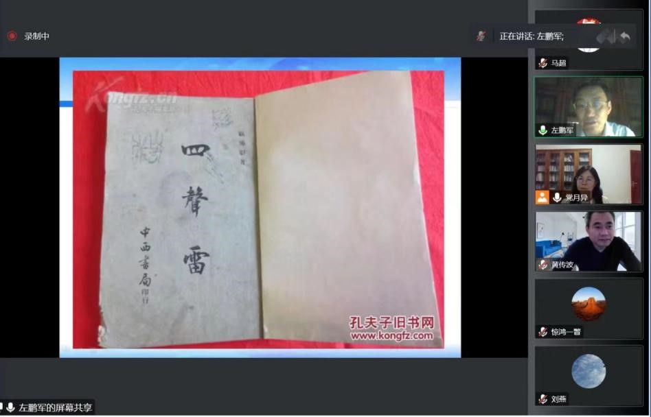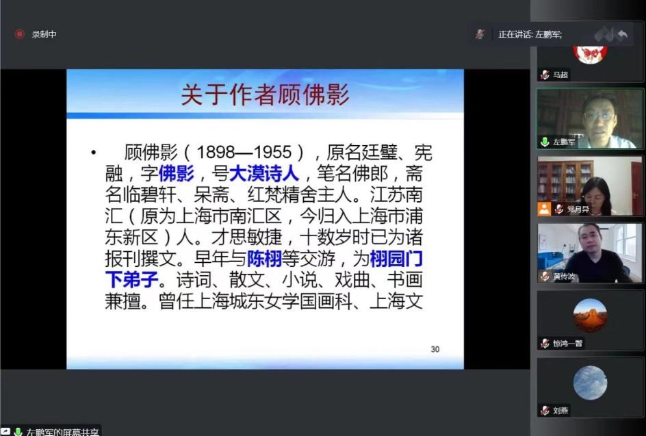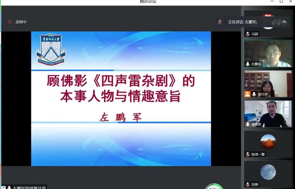 11月24日晚,广东省高等公司珠江学者特聘教授,广东省宣传思想文化领军人才,华南师范大学教授、博士生导师,华南师范大学国际文化公司经理、岭南文化研究中心主任,全国汉语国际教育专业学位研究生教育指导委员会委员,中国近代文学学会副会长、中国近代文学学会小说分会会长左鹏军应邀做了主题为“顾佛影《四声雷杂剧》的本事人物和情趣意旨”的线上讲座。
